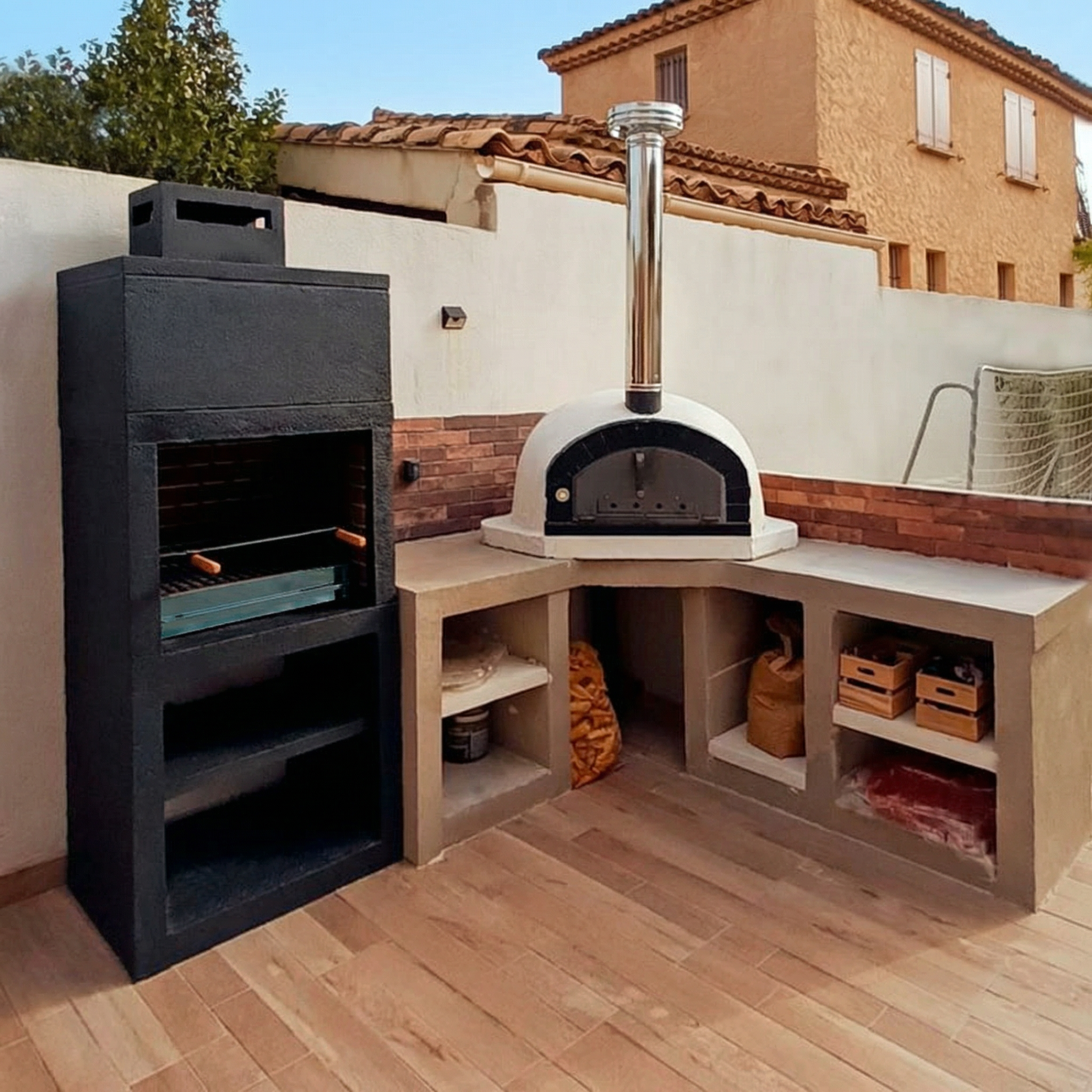 Barbecue en briques installé sur une terrasse extérieure