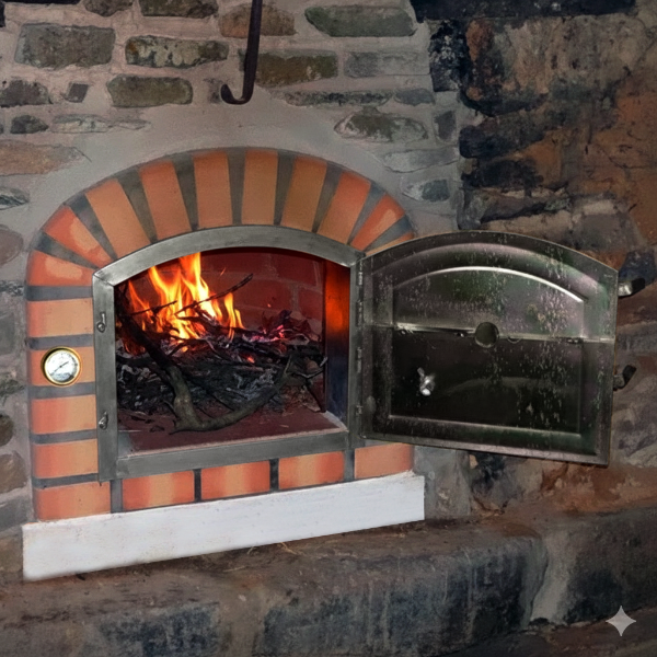 - Porte en acier zingué: L’acier galvanisé offre un excellent équilibre entre rapport qualité-prix, durabilité et esthétique. Sa couche de zinc protège efficacement contre l’humidité et la rouille, ce qui le rend idéal pour les fours installés en extérieur et exposés aux intempéries.