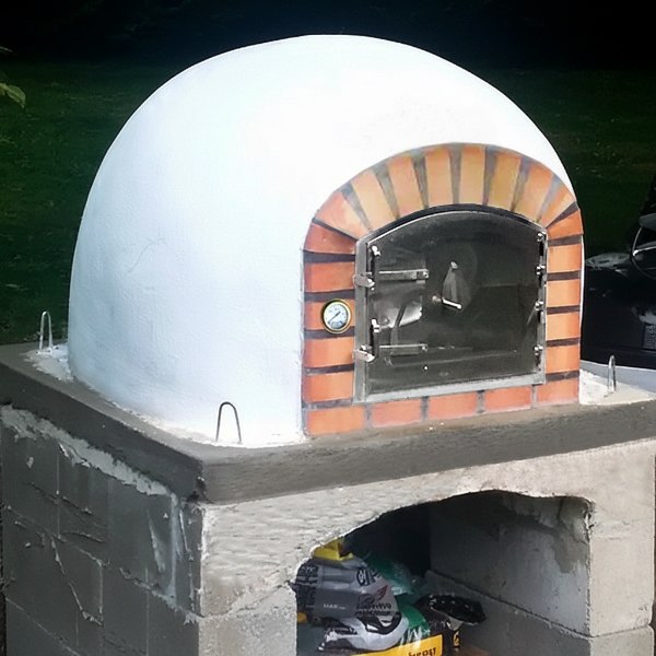 Dôme et sole entièrement en briques réfractaires, avec isolation en laine de roche et finition extérieure en ciment et argile 100 % naturelle — aucun habillage supplémentaire nécessaire.