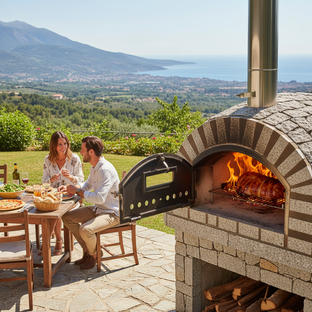 Sa structure robuste, fabriquée avec des matériaux de qualité, assure durabilité et résistance face aux intempéries et à l’usage intensif. Le design soigné du four allie esthétique moderne et fonctionnalité, s’intégrant parfaitement dans tous les espaces extérieurs.